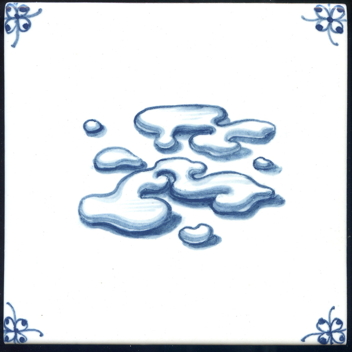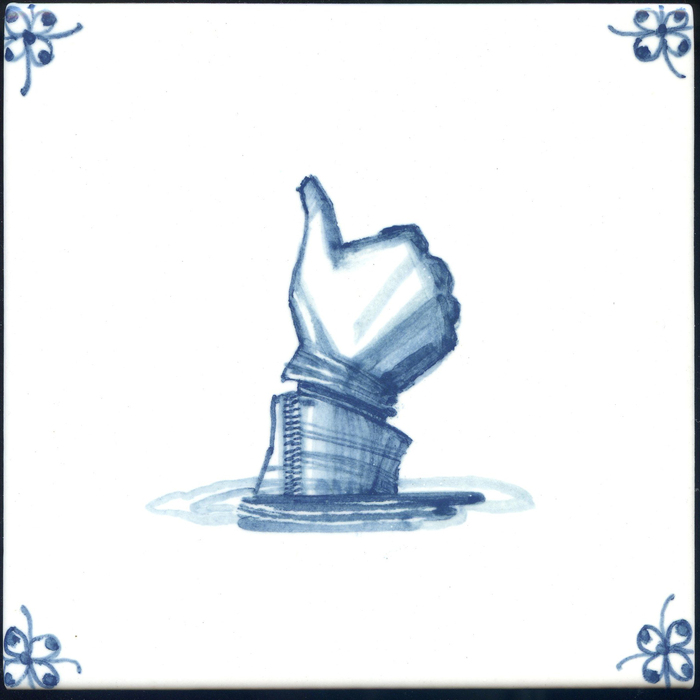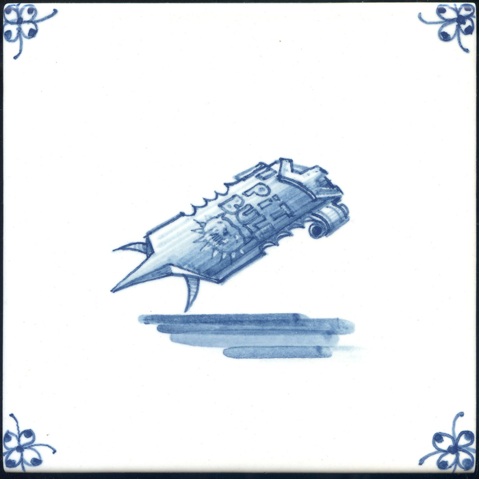 Что это? У голландцев был целый жанр росписи, который мы называем "малые формы", в рамках которого на плитке изображались предметы быта. Зеркальце, картинка в рамке, стул, сапоги, ложка — все, что угодно. Главное, чтобы под предметом была падающая тень. Тень в наличии. А от чего она падает-то? А это что?