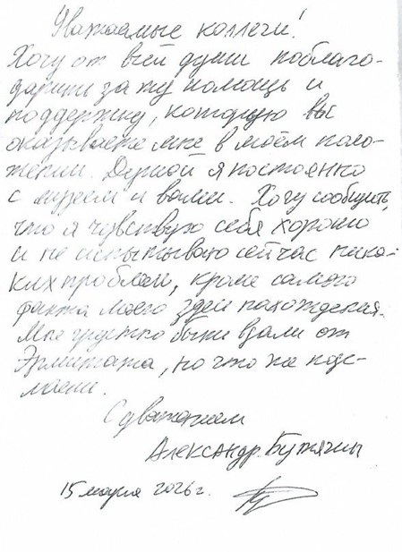 Хочу от всей души поблагодарить за ту помощь и поддержку, которую вы оказываете мне в моём положении. Душой я постоянно с музеем и вами. Хочу сообщить, что я чувствую себя хорошо и не испытываю сейчас никаких проблем, кроме самого факта моего здесь нахождения.