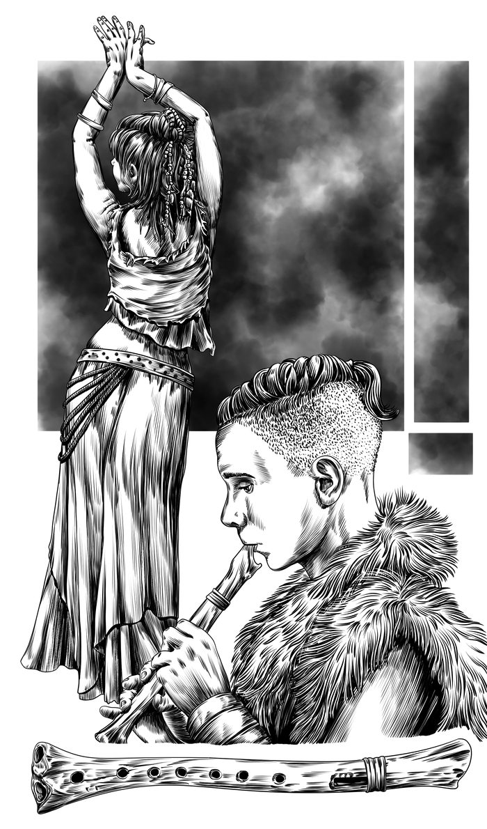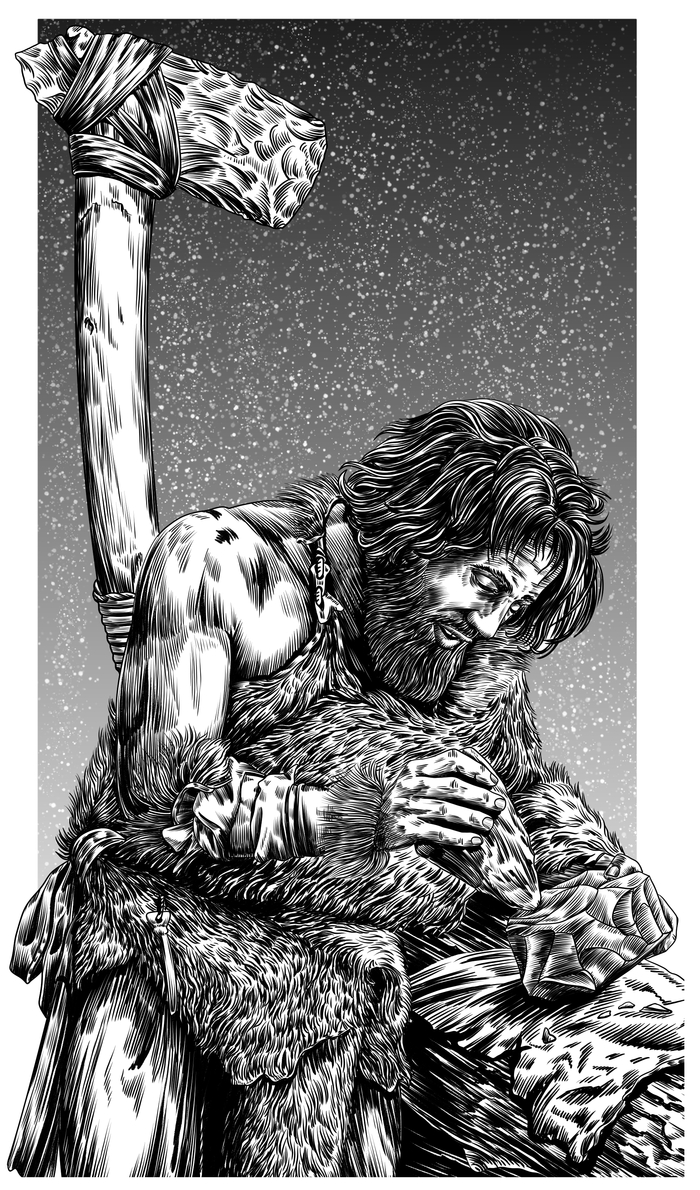 Ребёнок, юноша и молодой неандерталец. Цифровое изображение автора на основе эскиза Тома Бьёрклунда.