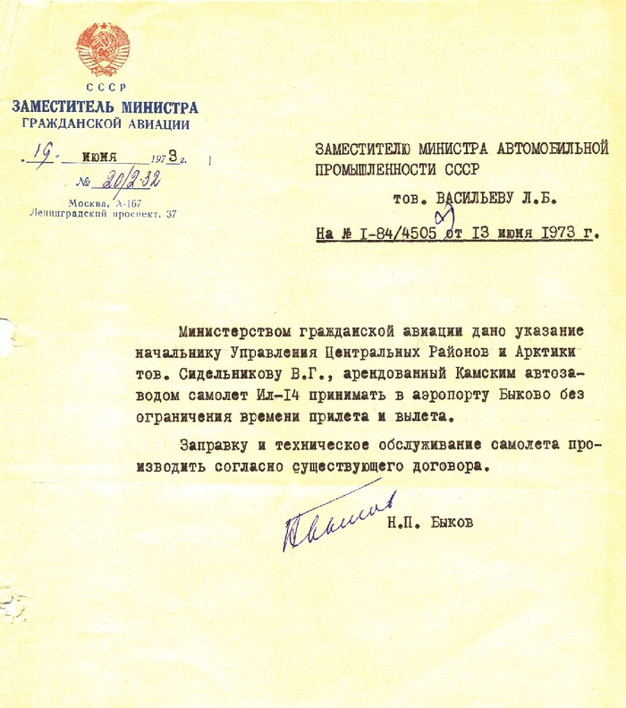 Доставка специалистов и документации из столицы в Челны и обратно осуществлялась по воздуху. С апреля 1971 года дирекция арендует Ил-14 у казанского авиаотряда. Аэропорт Быково выделил для приёма этого рейса специальные часы, но график для «КАМАЗа» неудобен, и потому Л. Б. Васильев в письме от 13 июня 1973 года, «в виде исключения, учитывая особую важность и сокращённые сроки строительства Камского автозавода», просит своего коллегу – заместителя Министра гражданской авиации – снять ограничения.