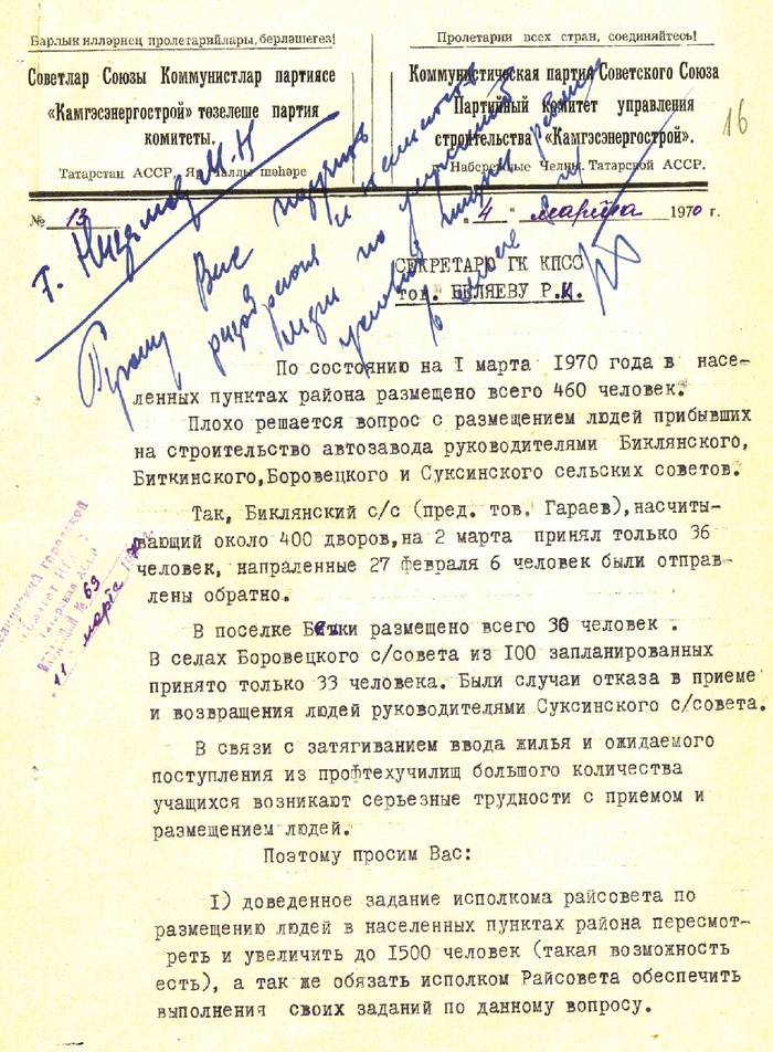 Ежегодно в период строительства население в городе увеличивалось на 30-40 тысяч человек. Рабочие и специалисты, представители более 70 национальностей, съехались на стройку в Набережные Челны. На самой строительной площадке работало более 100 тысяч человек. Партком «Камгэсэнергостроя» просит помощи в решении ситуации с жильём, обращаясь с письмом лично к секретарю горкома КПСС Р. К. Беляеву.