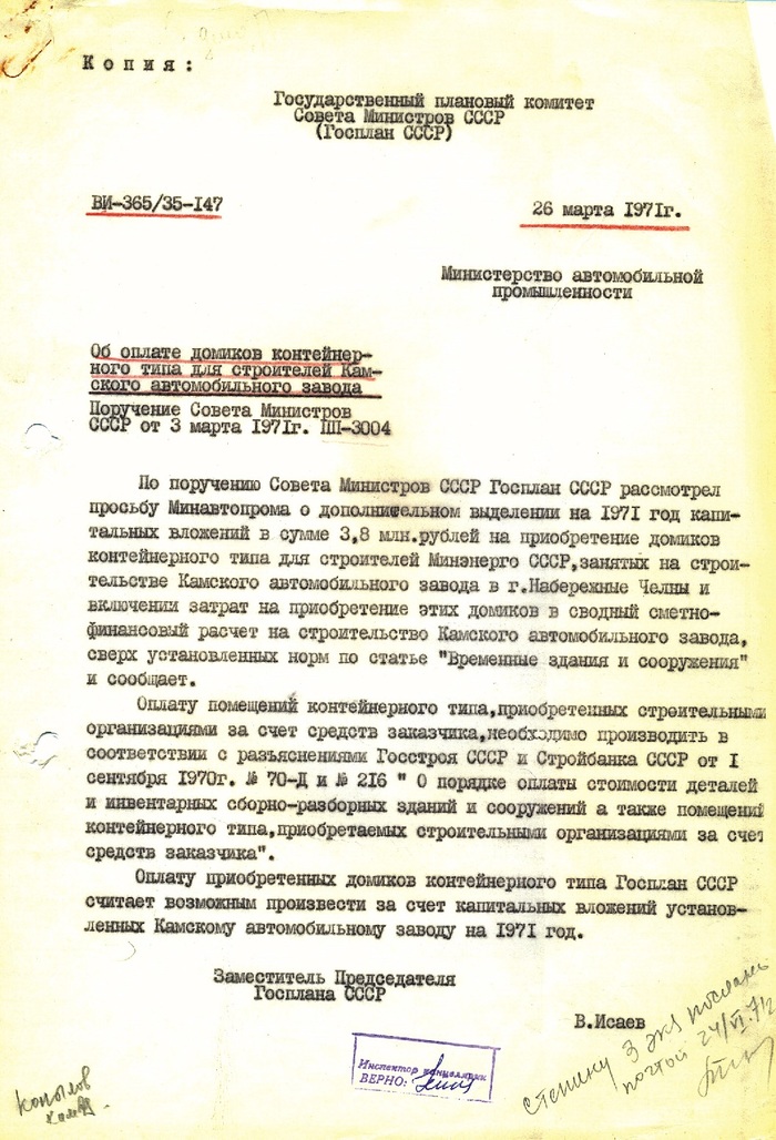 Укрепление рублём служб дирекции строящегося «КАМАЗа» – тоже своего рода закладка фундамента. Для этого в ведение Управления капстроительства передаётся из промышленности фонд заработной платы на 1971 год. Не беда, что на календаре уже 5 июля…