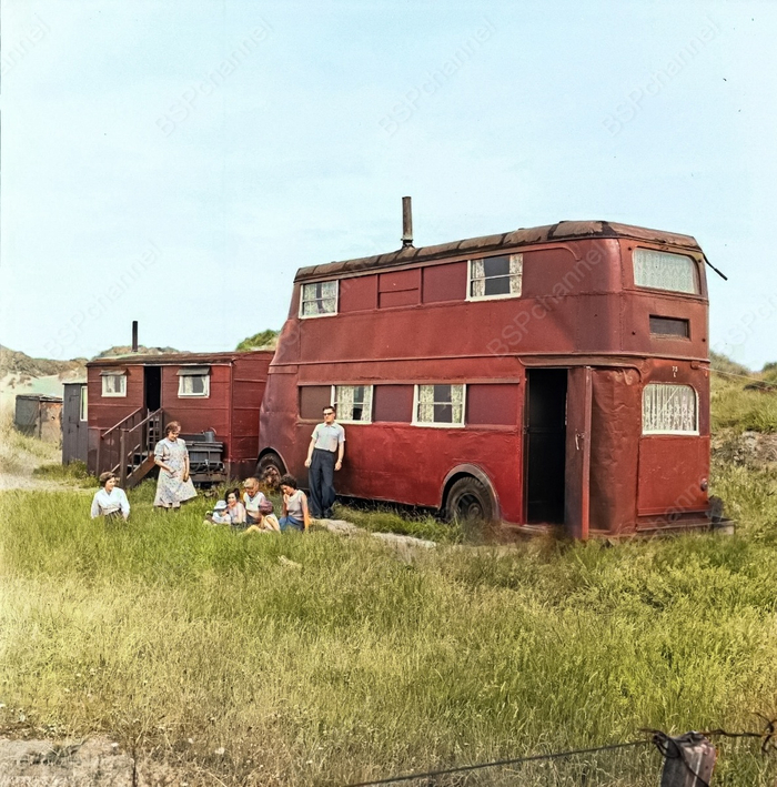 Разобранные автобусы и троллейбусы, переоборудованные в жилые помещения на пляже Талакр, в двух милях от Престатина. Великобритания, 1959 год.