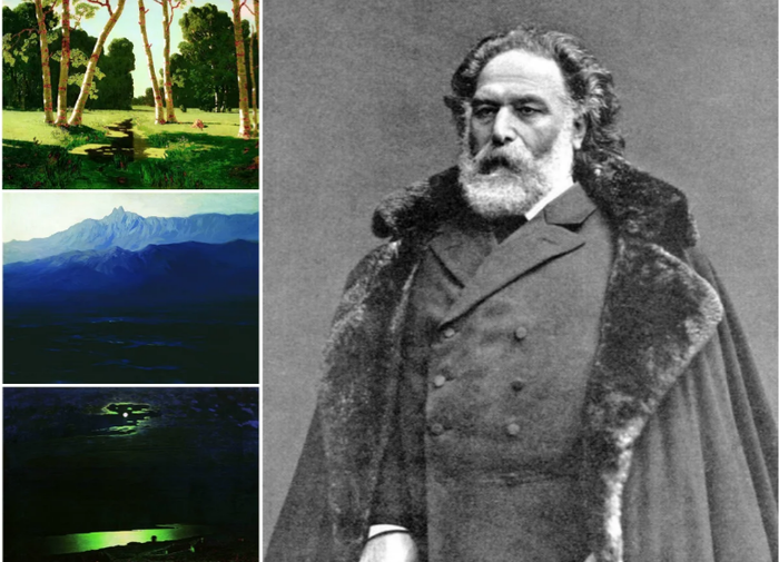 Справа - фото Архипа Куинджи, слева - его работы: "Берёзовая роща", "Ай-Петри. Крым" (эта картина была украдена 27 января с выставки в Третьяковке, но найдена уже на следующий день) и "Лунная ночь на Днепре", самое знаменитое полотно художника.