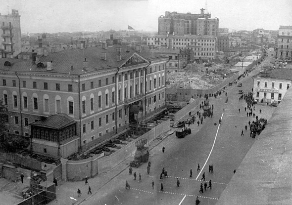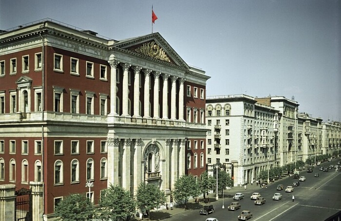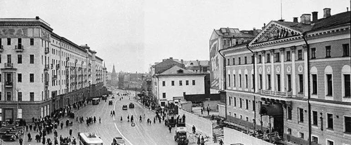 Власти стремились расширить и выровнять дороги в центре города, чтобы справиться с увеличивающимся потоком транспорта. Улицу Горького (ныне Тверская) расширили на 40–60 метров. Здания, выходящие за красную линию, либо сносили, либо перемещали вглубь квартала, если они не соответствовали архитектурному ансамблю. Это позволило сохранить жилищный фонд и избежать массового переселения людей.