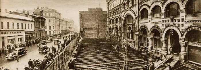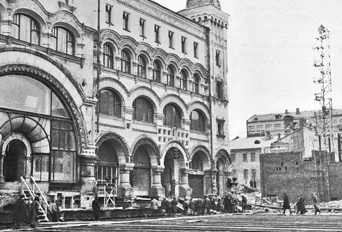 Здание на Горького, д. 24 (сейчас это ул. Тверская, д. 6) в 1938 году передвинули на 50 метров вглубь квартала. На его месте возвели жилую сталинку. Постройка в неорусском стиле с элементами барокко и модерна оказалась самой тяжёлой из передвинутых в мире — 23 000 тонн. На подготовку к передвижке ушло около 6 месяцев. С помощью 36 рельсовых путей и 2,1 тыс. катков её переместили за трое суток.