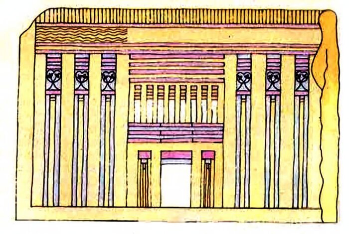 Это зарисовка изображения на саркофаге главного жреца V-й династии Равера, (Гиза). Хорошо видны дворцовые башни, удлиненные ниши, между ними двери и окна.