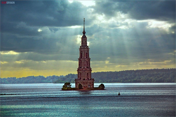...а затонувшая колокольня в Калязине. Колокольня построена в 1800 году при Николаевском соборе (воздвигнут в 1694 году) бывшего Николо-Жабенского монастыря в стиле классицизма; имела пять ярусов, купол с главой и шпилем[2]. Колокольня (высота 74,5 м) отстроена за 6 лет. Она имела 12 колоколов. Самый большой колокол в 1038 пудов отлит в 1895 году на деньги монастыря в честь восшествия на престол Николая II.
