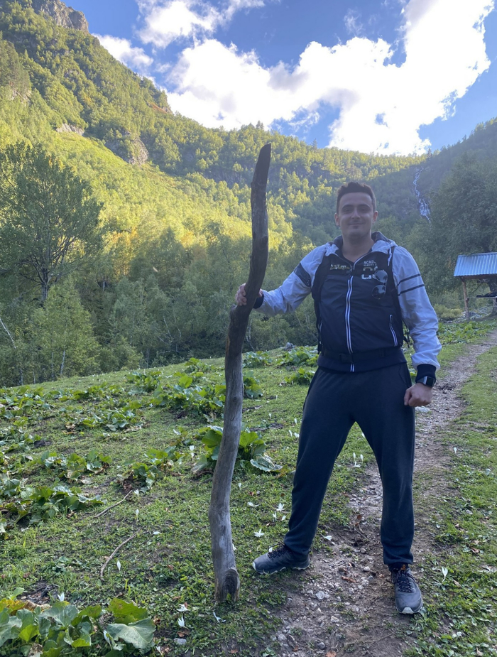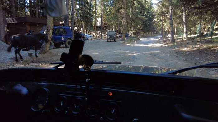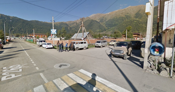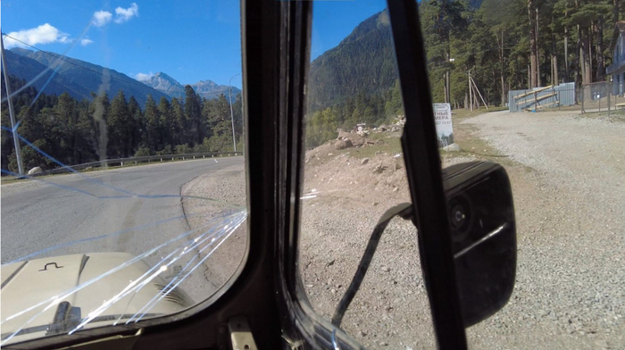 От перекрёстка идём пешком и пытаемся ловить попутки, которые могли бы довезти нас непосредственно до поляны Таулу, до которой ещё несколько километров. Через несколько десятков метров дорога сменяется с асфальта на дико разбитую то ли гравийку, то ли просто какую-то дорогу, состоящую из камней и корней деревьев. Кстати, это было первым намёком на сложность сегодняшней дороги в горы.В тени сосны отдыхает Аслан — мужчина лет пятидесяти. На своём Уазике он соглашается довезти нас за 500 рублей к начальной точке нашего маршрута. Кстати, у нашего водителя какой-то уникальный Уазик, то ли на дизеле, то ли с полным приводом и какими-то фишками — я уже и не помню точно. Но, машина выглядит, на удивление, весьма ухоженной.