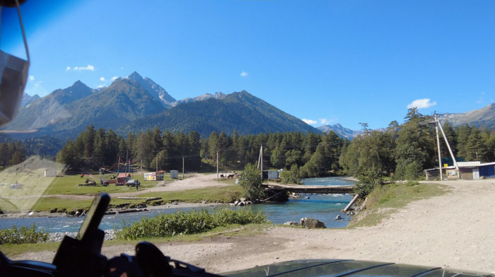 Подъезжая к знаменитому мосту через реку Псыш, Аслан рассказывает, что много лет назад именно он строил этот мост и возил сюда брёвна для строительства на тракторе с гор, которые видны вдали. Со стороны мост выглядит не очень уверенно, но когда мы на него въезжаем— оказывается вполне себе устойчивым.