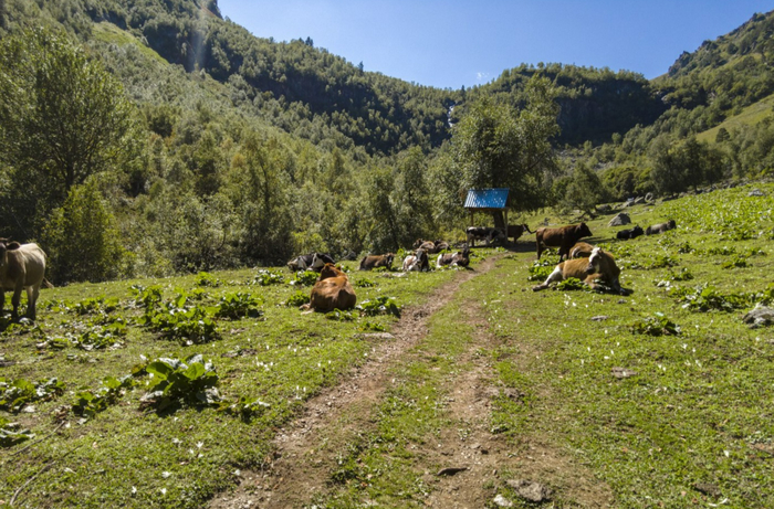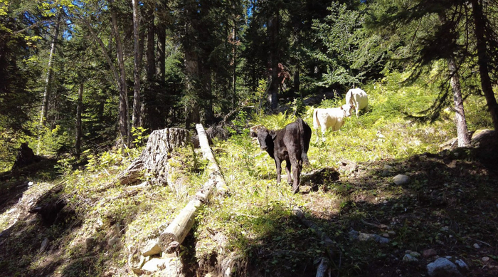 Пока мы идём через лес, мы слышим крики каких-то животных. Я уверен процентов на пятьдесят, что это коровы или быки. Аня топит за то, что это какие-то кабаны или медведи. Не знаю, возможно это и те и другие, но чуть позже быков и коров мы всё таки встретили :) Почему-то не у всех на шее висят колокольчики, поэтому если вы знаете, по какому принципу на этих милых созданий надевают звоночки— напишите в комментариях.