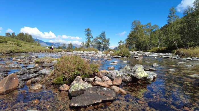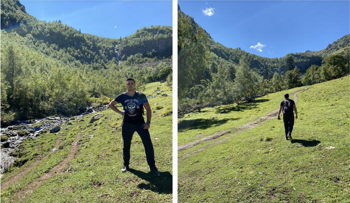 Через час пути мы попадаем на Альпийские луга. Интересно, Альпийские луга называются так просто из-за сходства с Альпами, или это какое-то научное название, показывающее тип полей, гор и природы вокруг? Если вы об этом знаете — напишите в комментариях. Именно в этом месте я пробую самую вкусную горную воду за всю поездку (не считая минералки Архыз из магазина).