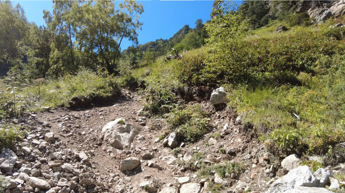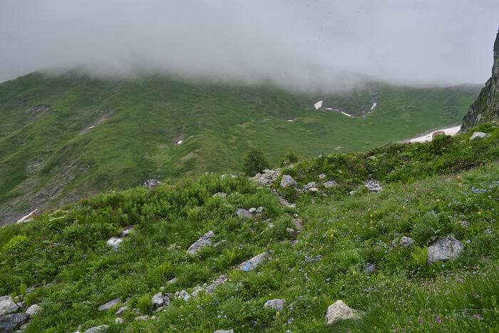 После небольшого привала мы выдвигаемся дальше. В какой-то момент начинает казаться, что дальше дорога будет проще и мы просто сможем спокойно гулять по лугам и наслаждаться пейзажами вокруг. Не тут-то было. Через метров триста нас снова ждёт крутой подъём, причём крутой настолько, насколько мы и представить себе не могли. Именно в таких местах начинаешь ещё больше ценить удобную обувь и третью точку опоры, если она у тебя имеется :)
