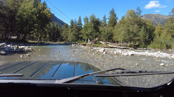 Где-то через километр пути приходится ехать вброд, через реку. Мне это всё напоминает передчи из серии National Geographic, когда парни на крутых внедорожниках гоняют по горам и полям через реки — весьма впечатляет. Аслан оставляет нас возле точки старта, правда не той, которую я запланировал, и мы начинаем наш поход.
