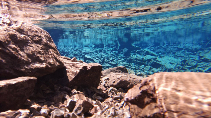 Пляж и вход в озеро — мелкая и острая галька. Я взял с собой подводный бокс, для того чтобы отснять красивые кадры под водой.