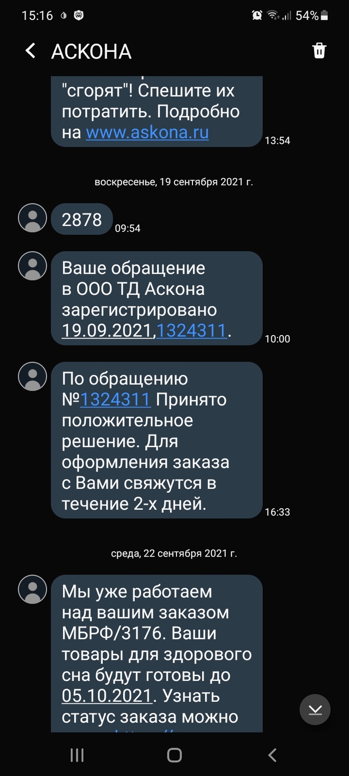 Вечер 7 октября, время 20,00 - у нас ни второго матраса, ни водителя с матрасом, и матрас, который не оплачен, который лежит. Я звоню на горячую линию Асконы, узнать, а когда ж прибудет водитель с заказом. И мне там сообщают, что заказ наш доставлен и оплата за него в полном размере прошла. Я описываю всю ситуацию, что деньги у нас, матрасов ровно половина и как бы хотелось всё получить и оплатить. Барышня на линии кивает головой (наверное), выслушивает всю ситуацию, несколько раз просит повисеть на линии, и составляет претензию о случившимся. И сообщает, что вам позвонят из претензионного отдела в течение двух дней. Окей.