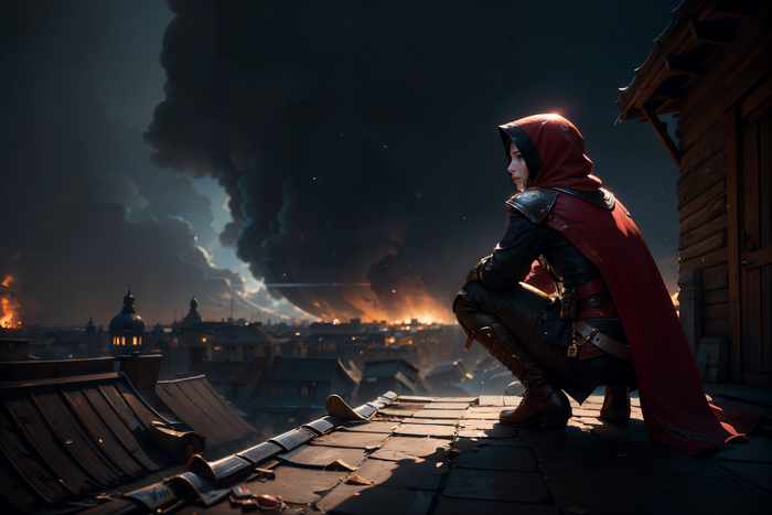 (woman), blue eyes, white hair, razor cut, (action-packed:1.4), in the pose of a killer jump from the roof, view from below, looking up, solo, upper body, detailed background, ancient rome, ancient roman theme, determined expression, assassins creed, master assassin, white tattered leather assassin clothes from game assassin creed ,white hood, red cape, revolutionary, rural landscape in background, floating particles, dirt, rain, dreamlike ethereal atmosphere, artstation, concept art, smooth, sharp focus, illustration, redshift render,minimalism style art by Ed Binkley, art by Atey Ghailan, art by Studio Ghibli, art by Jeremy Mann, art by Gregory Manchess, art by Antonio Moro, trending on ArtStation, trending on CGSociety,<lora:epiNoiseoffset_v2:1.0>