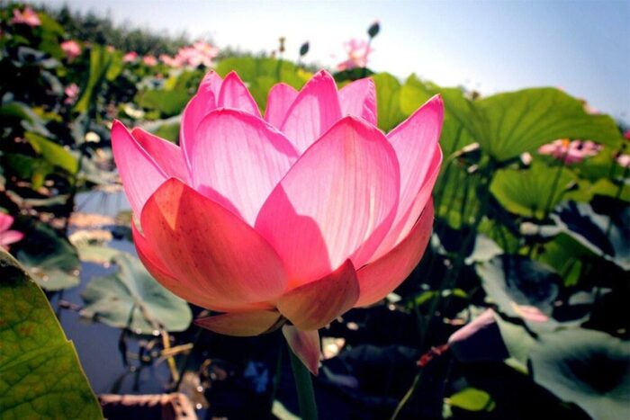 Огромные цветки лотоса, диаметром до 20 см, в течение дня направлены в сторону солнца. Летом в Астраханской области жарко, поэтому нежные лепестки быстро опадают. Каждый цветок живет всего 2–3 дня, но из-за большой площади плантаций создается ощущение бесконечного цветения.