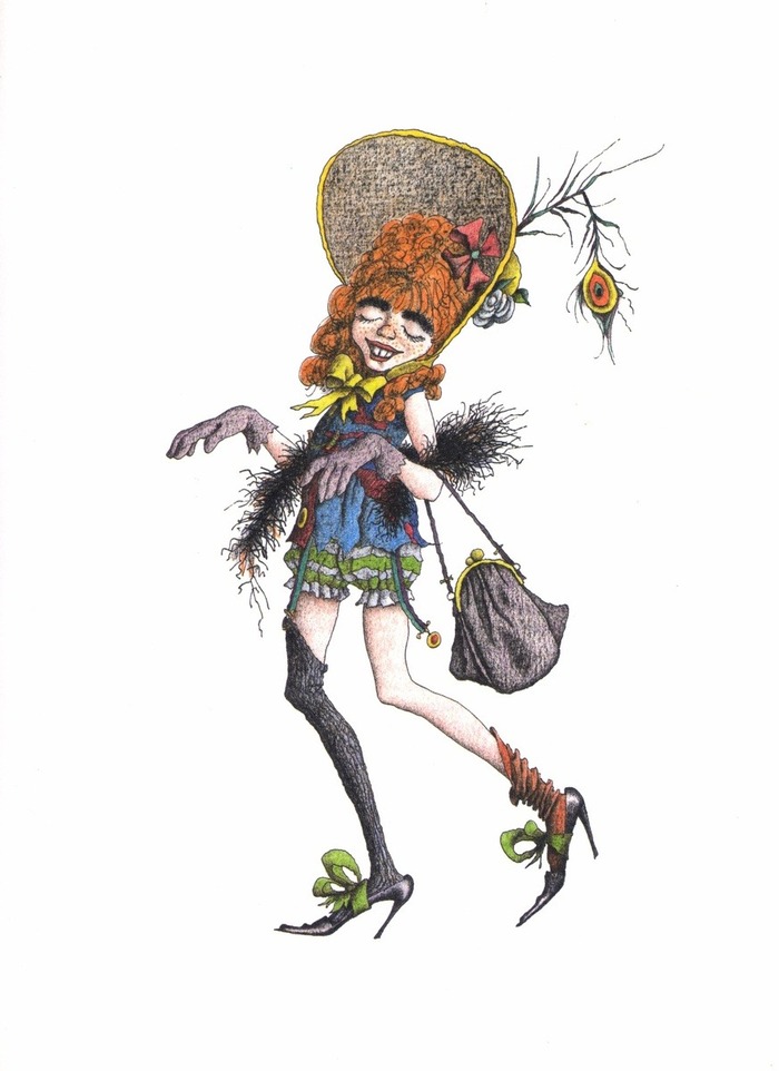 Да, с этим Томми и Анника не могли не согласиться. Пеппи подвела брови углем и намазала красной краской ногти и губы. На ней было платье до пят, с большим вырезом на спине, в котором виднелся красный лифчик. Из-под платья торчали ее огромные черные туфли, но и они выглядели празднично: Пеппи приделала к ним зеленые помпоны — Пеппи носила эти помпоны в особо торжественных случаях.