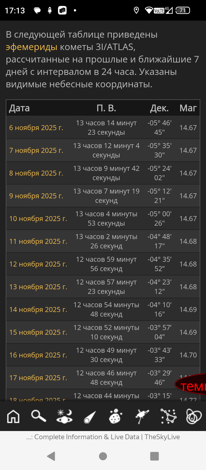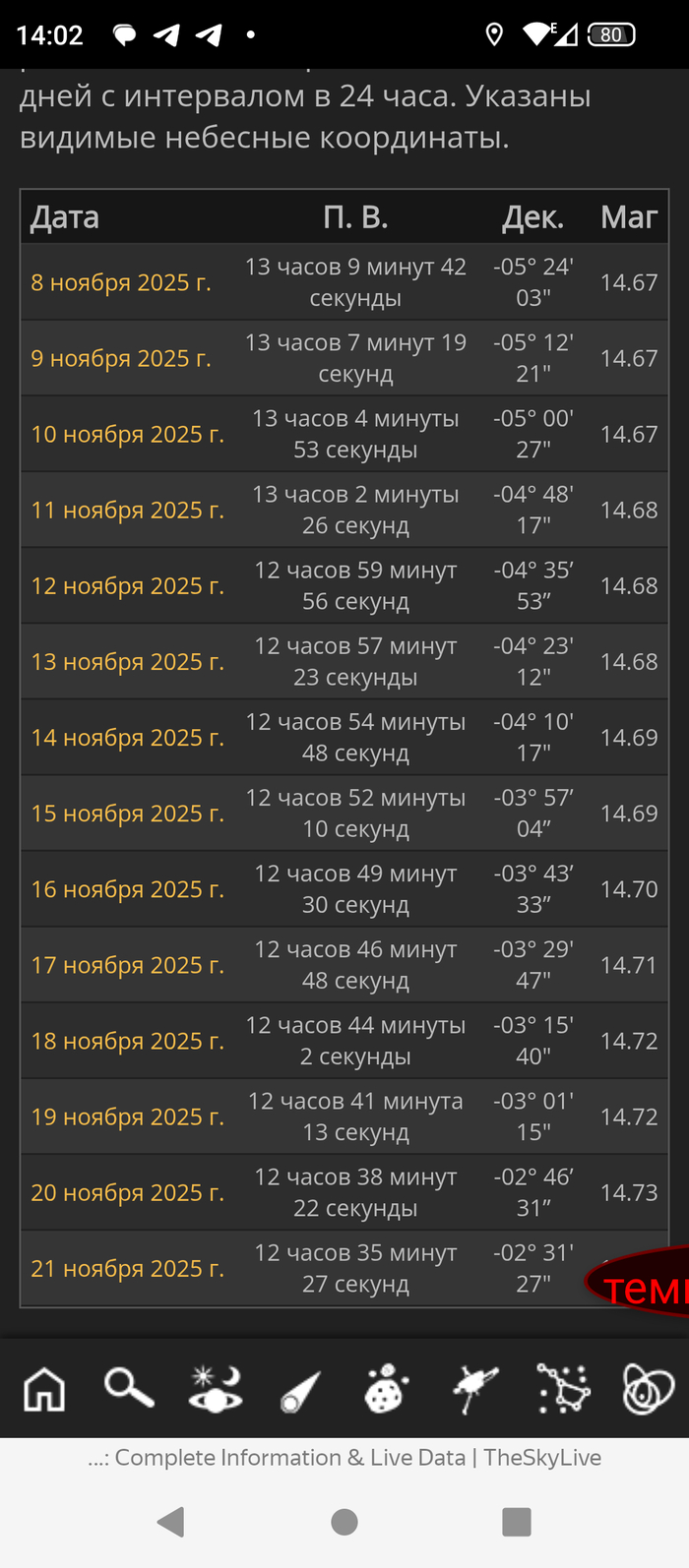 Параллельно - слежу за его эфемеридами. Если кто не знает, это - координаты в небе для астрономов, где искать комету.