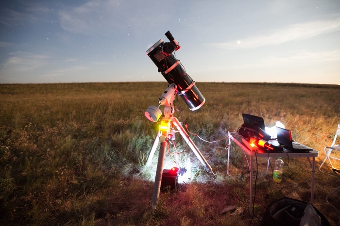 Перед началом съёмки фотоаппарат с объективом должны около часа постоять на свежем воздухе (без батареек). Дело в том, что на холоде объектив сжимается, его размеры немного, но уменьшаются (физика, никуда от неё не уйдёшь, объектив тоже становится короче на морозе). На деле это приводит к тому, что сбивается фокусировка объектива. Простояв час на холоде, объектив остывает до нужной температуры и его размеры в течение ночи не меняются. Фокусировка остаётся постоянной, но проверять её время от времени всё-таки нужно. Выносить технику можно через полчаса после заката солнца. От заката до наступления астрономической ночи, когда можно начинать фотографировать, проходит около 2 часов. Через час после заката на небе уже видна Полярная и другие яркие звёзды. В это время можно сделать полярное выравнивание – настроить монтировку так, чтобы ось её вращения точно совпадала с осью вращения Земли. Тогда можно будет снимать на длинной выдержке без смазывания кадров.