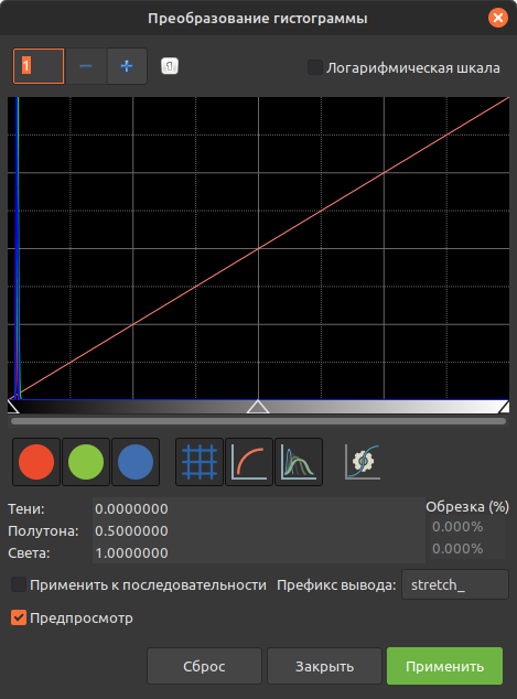 Заходим во вкладку "Обработка" - "Растягивание" - "Преобразование гистограммы". Можно вручную, можно автоматически. Во втором случае в шестеренку с графиком тюк. Теперь можно авторастягивание внизу изменить на линейный режим, работать будем в нем.