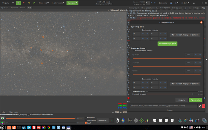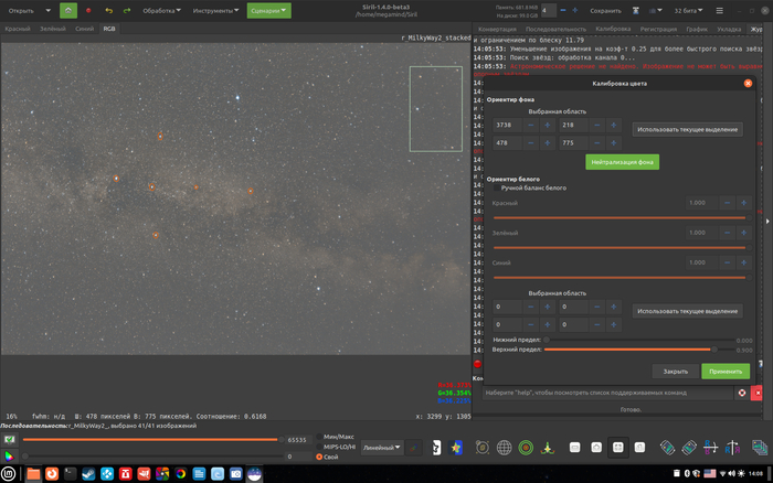 Далее переходим к калибровке цвета. Вообще в Siril есть фото- астрометрическая калибровка, но она будет работать хорошо и правильно тогда и только тогда, когда техника позволяет Siril извлечь метаданные снимка. С мануальной древней оптикой работает не всегда, поэтому можно произвести калибровку вручную.