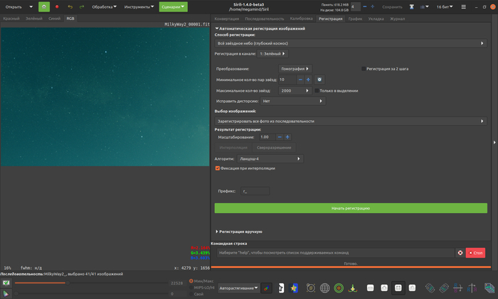 Переходим во вкдадку "Регистрация", выбираем "Все звёздное небо", мы ж Млечный путь снимаем, и тыкаем "Начать регистрацию"
