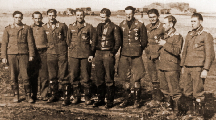 Лётчики эскадрильи 9./JG 52, в том числе участники боёв 14 октября 1941 года. Крайний слева Генрих Фюлльграбе, далее Альфред Эмбергер, четвёртый слева Йоганн Кляйн, шестой Герман Граф. В центре командир подразделения гауптман Франц Хёрниг (Franz Hörnig). Сентябрь 1941 года