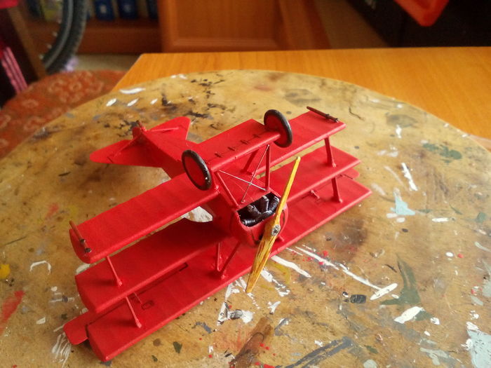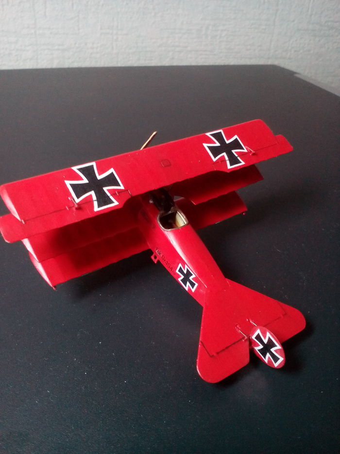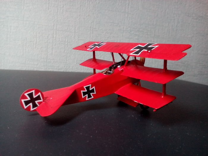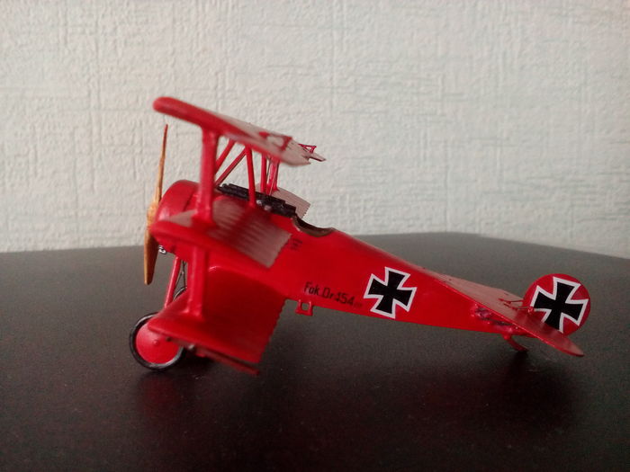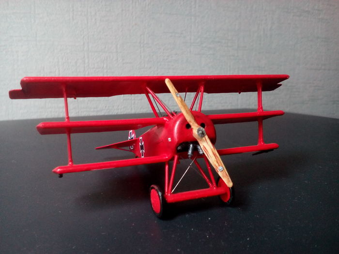 Показан знаменитый красный Dr.I. Манфреда фон Рихтгофена, командира эскадрильи Jasta 11 "Воздушный цирк" (название возникло из-за того что многие самолёты эскадрильи по примеру фон Рихтгофена были частично либо полностью окрашены в яркие цвета - жёлтый, чёрный, белый...). Почему не стандартный зелёный или серый камуфляж? "Я не хочу прятаться от врагов, я хочу их пугать" - отвечал ас, погибший в возрасте 25 лет 21 апреля 1918, но успевший за недолгую жизнь сбить по разным данным от 73 до 84 самолётов противника.