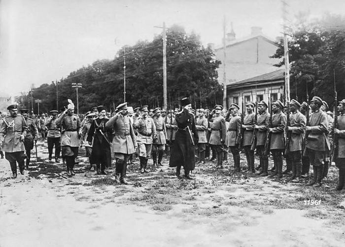 Павел Скоропадский на смотре Серожупанной дивизии в сопровождении немецких офицеров, 1918 год.