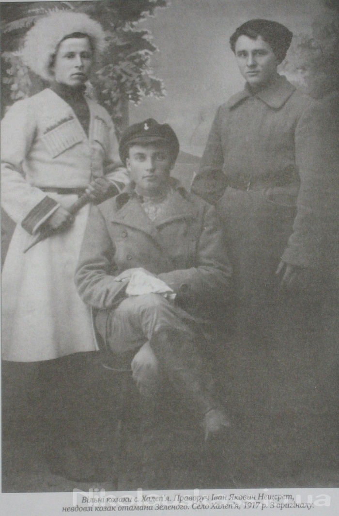 Сотник Дмитрий Любименко, Даниил Терпило (отаман Зеленый) и артиллерист Василий Дюжанов. Даниил Терпило в центре фотографии.