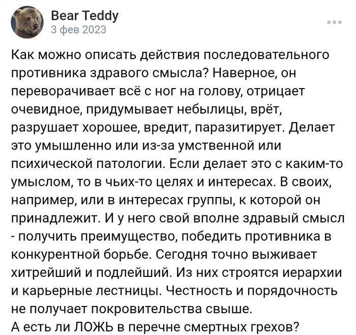 Вывод: Он может и не быть лжецом в душе, но его текст — это лживый текст. Он использует инструменты, функционально тождественные вранью: подмену, демагогию, создание неопровержимой догмы. Поэтому ваше ощущение, что он «врет», абсолютно верно по своей сути, даже если моральная оценка его личности требует более тонких инструментов.