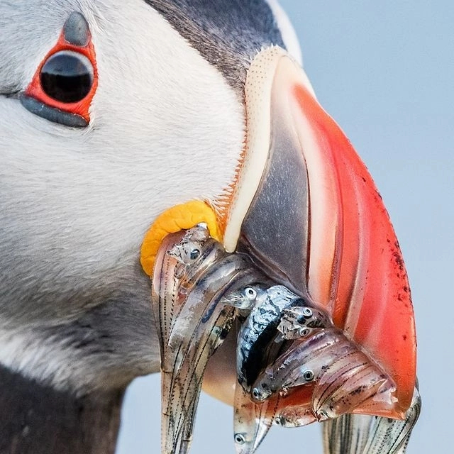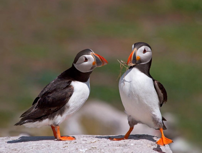 Атлантический тупик (Fratercula arctica). Эти забавные птички — просто замечательные рыболовы, умеющие буквально летать под водой, набивая полный клюв рыбками. А в норах на склонах островов их ждут голодные птенцы, которым этот улов и предназначен. У героя фотографии рыбки в клюве крупные, поэтому их всего две.