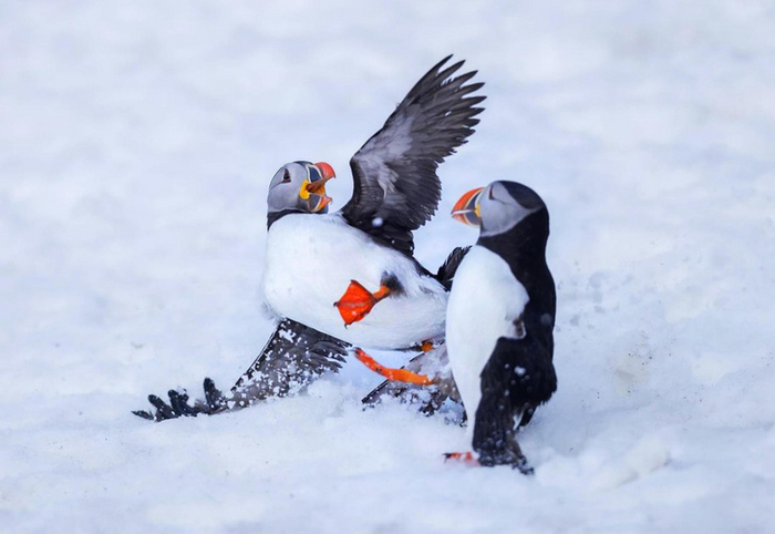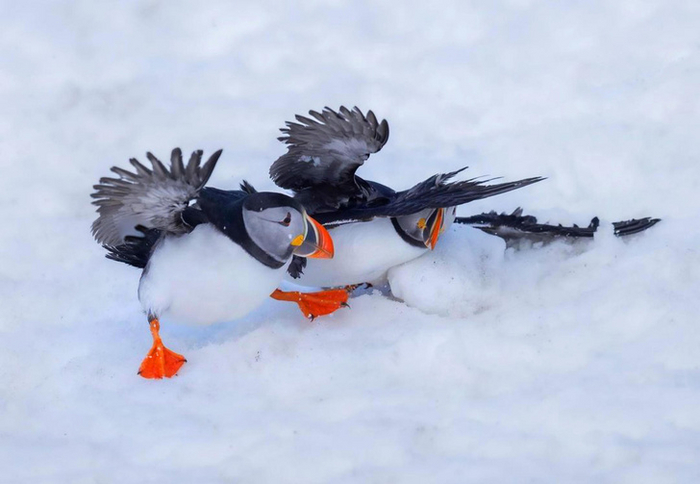 Фотограф из Великобритании Дани Коннор стала свидетелем поединка двух тупиков на острове Хорнойя. Незадолго до этого птицы прилетели на остров, чтобы вывести потомство.