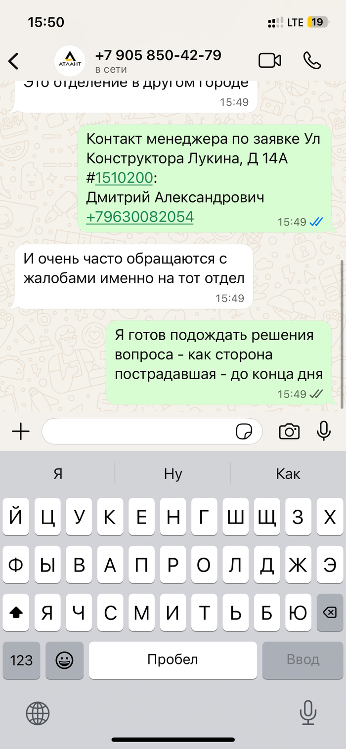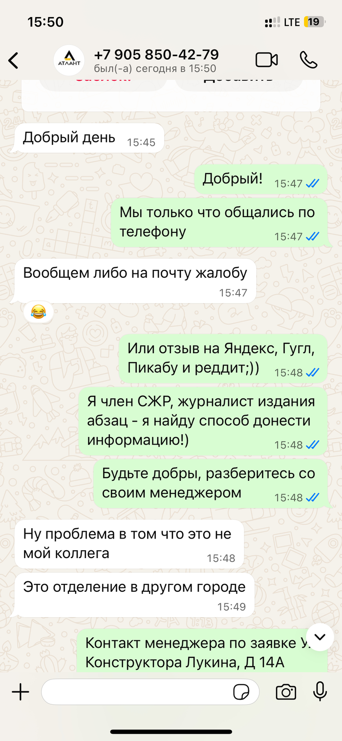 Фирма Атлант в вотсапе предложила мне написать жалобу на офф. почту компании, кстати…