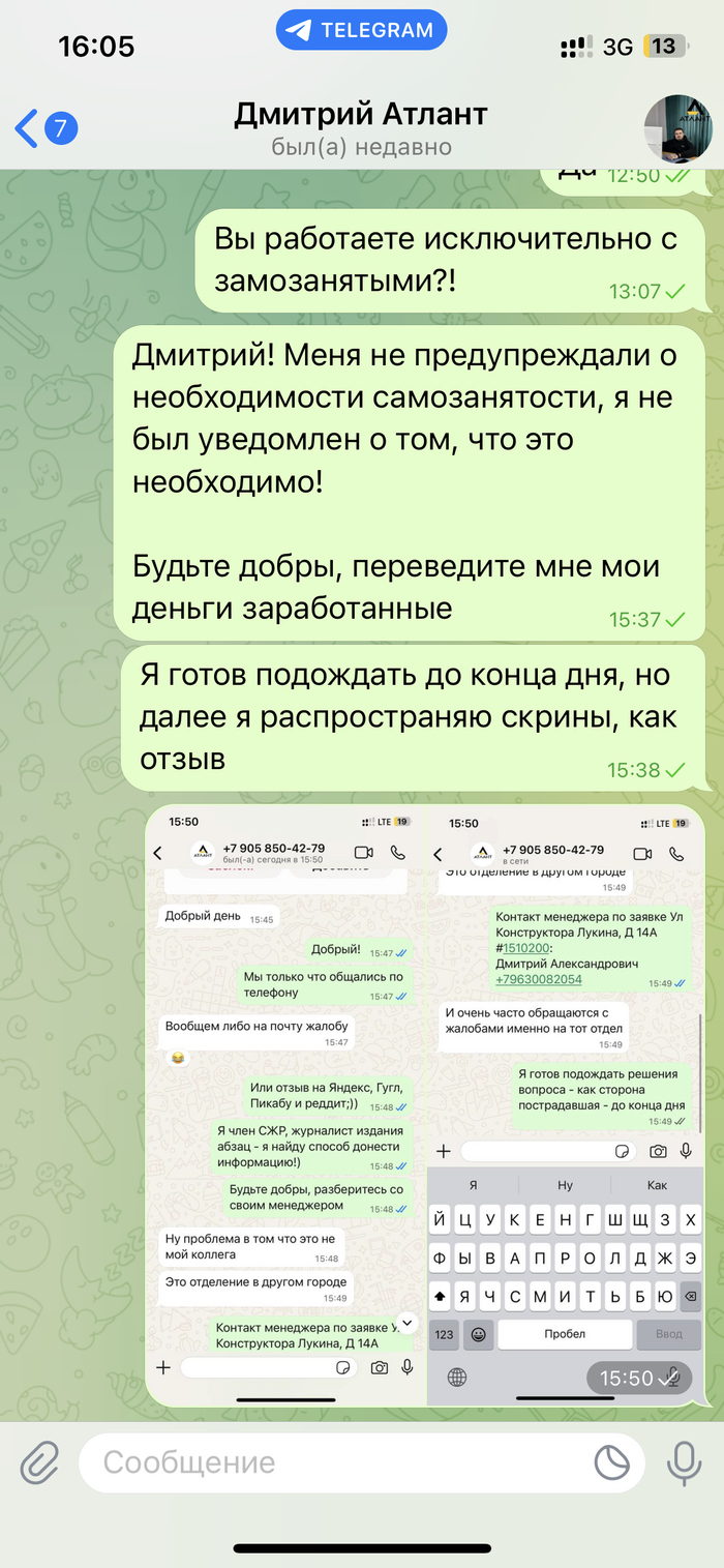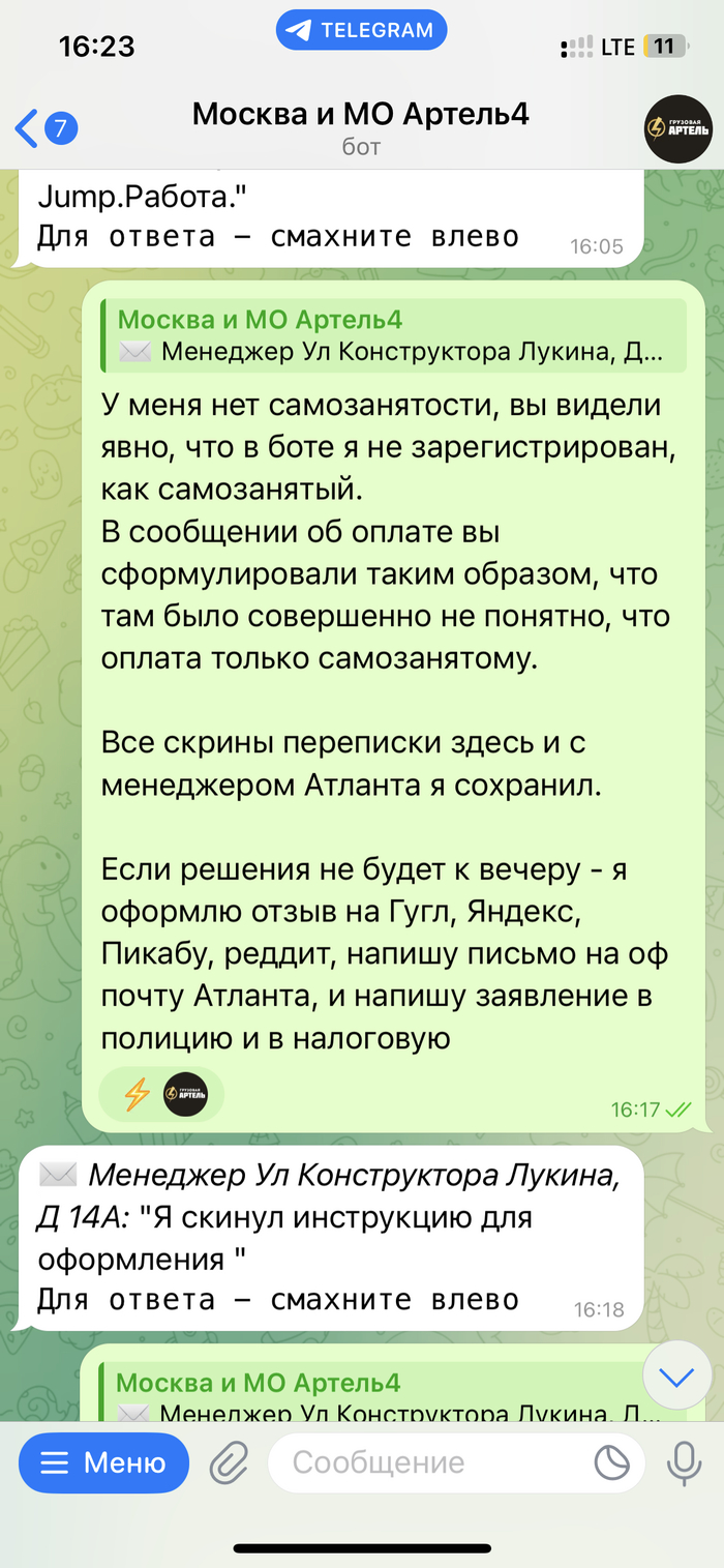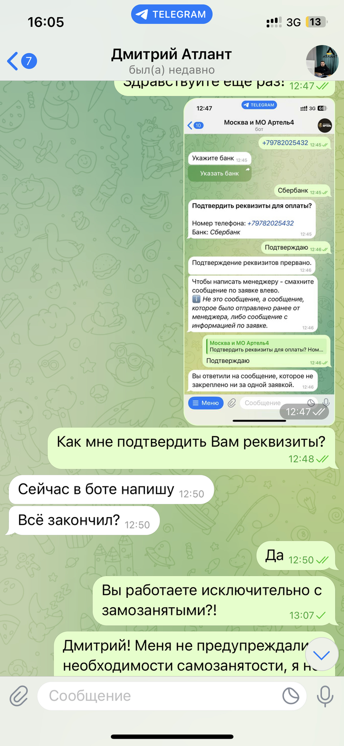 Далее мы переходим в вотсап и я узнаю, что другим способом, кроме как самозанятому, «тот отдел» оплатить не может и вообще «на тот отдел много жалоб»!!