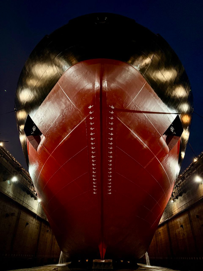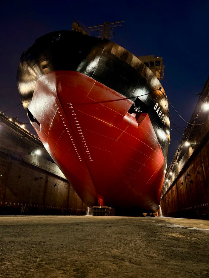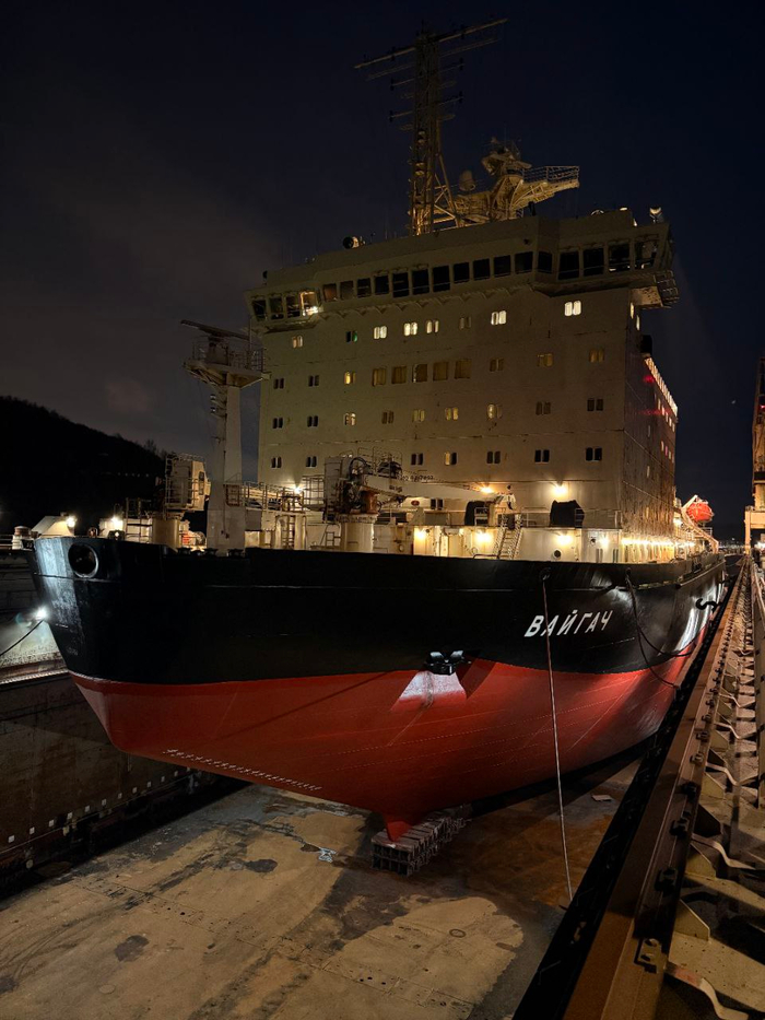 «Чукотка» — уже пятый ледокол проекта 22220. Его спустили на воду в ноябре 2024 года, и сейчас работы по монтажу и отделке внутренних помещений продолжаются.