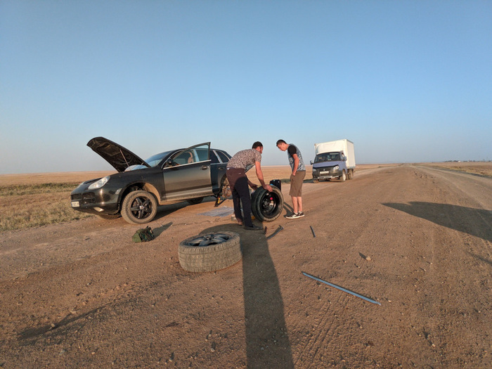 Дороги в Казахстане оказались ужасными, страна большая, власти за всем не доглядывают. От границы до Уральска ещё более-менее, а потом пошло асфальтовое крошево, благо был выбор ехать по левому или правому берегу реки Урал, так вот левее дорожка получше. Но и это были ещё цветочки, самый кошмар начался после Атырау, там асфальта вообще нет, дорога на Астрахань представляла собой разбитый фурами каменистый грейдер на протяжении 260 километров. Тут и там вдоль обочин стояли не выдержавшие испытаний машины с развалившимися подвесками и кузовами, брошенные своими водителями, которые вынуждены были отправиться в российскую Астрахань на попутках, чтобы купить необходимы запчасти для ремонта в полевых условиях. В самом Казахстане хуюшки, нет ничего в степи, никаких супермаркетов нет.