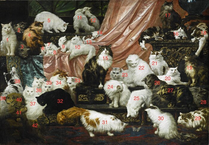 В 2015 году на аукционе «Сотбис» была продана картина "Любовники моей жены". Мужчин на ней вы не найдете, зато котиков там хоть отбавляй. А если точно, их там аж 42 (пруф в посте), причём все нарисованы в натуральную величину.