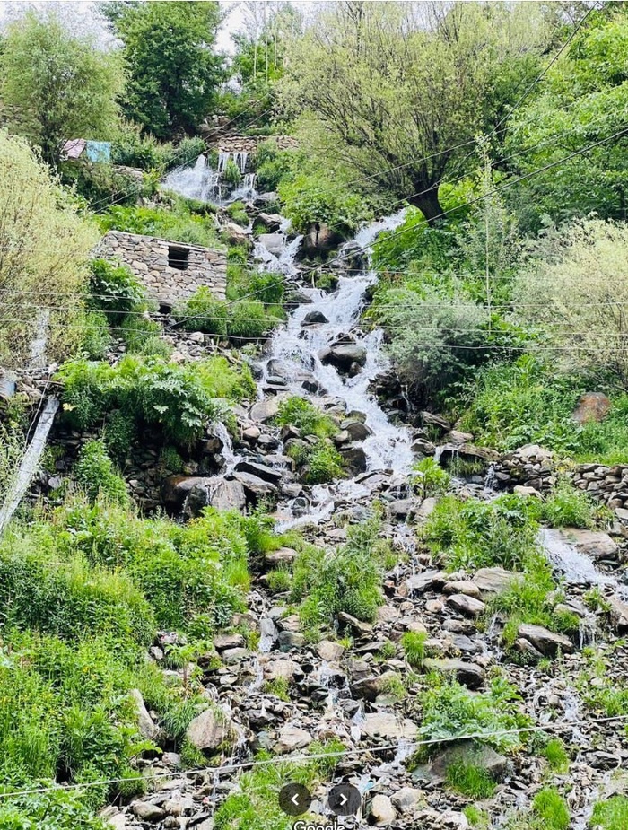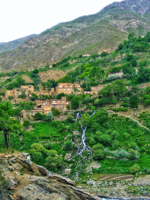 Напротив нас и водопада, на правом берегу речки Абдуллахейль, на крутом берегу расположился каскад домов. Из-под них вниз струилась белыми потоками вода.