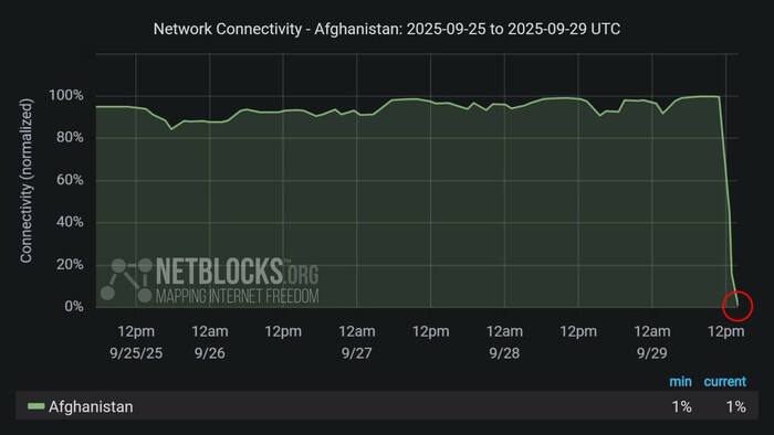Отключение началось утром 29 сентября постепенно: сначала упало несколько сетей, затем и телефонная связь. Сейчас по данным NetBlocks и Cloudflare Radar в Афганистане зафиксировано полное отключение интернета.