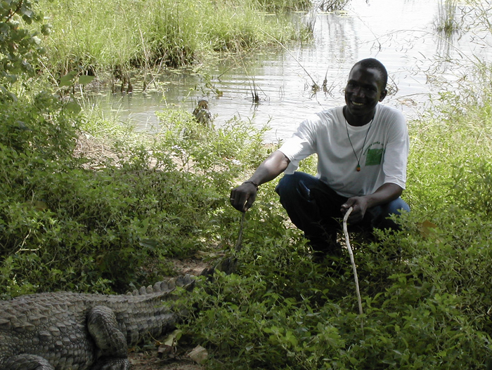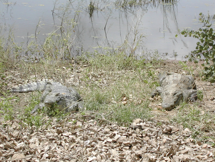 Так вот, если знаешь, как рефлексирует на добычу крокодил, то им можно управлять. Для начала, кроков надо из реки выманить. Местные знают их "в лицо" и по характеру... Вызов крокодила из воды происходит следующим образом: на веревку привязывают курицу и бросают ее в воду. Крокодил реагирует на хлопанье крыльев и выходит "посмотреть". Если это неправильный крокодил - мы уходим к другому участку берега. Пока не вышел "правильный" - добрый крок. Держались мы от них не так уж и далеко по расстоянию. Пока у крока не проснулся инстинкт охотника - он ленив. Кстати, они же рептилии и их активность зависит от "прогревания" на солнце. А мы были утром - в относительной для кроков прохладе.. Это первый "секрет" сговорчивости.
