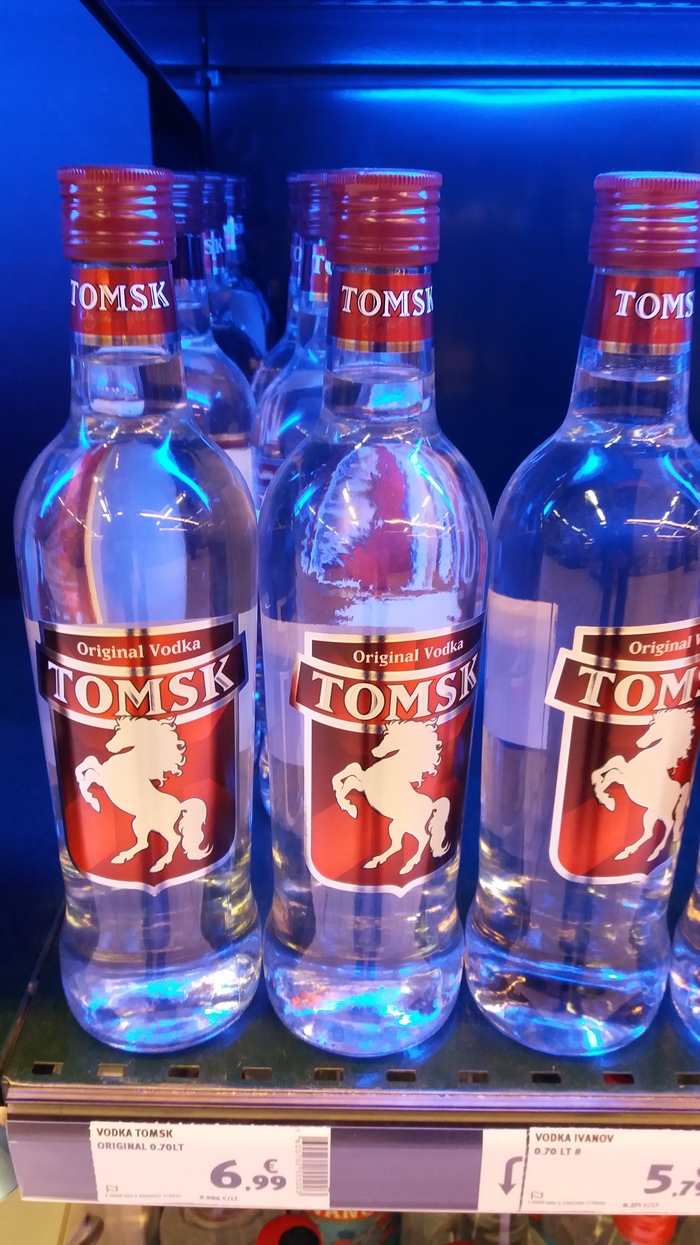 Ну и общий план: внизу - водка "Иванов" 37,5%, рядом - "Московская особая" 38% (потому что нелицензионная, а цена, как на лицуху - 13 евро за 0,7л), в чёрной бутылке справа вверху - "Томск" 6,7% (для детей наверное).