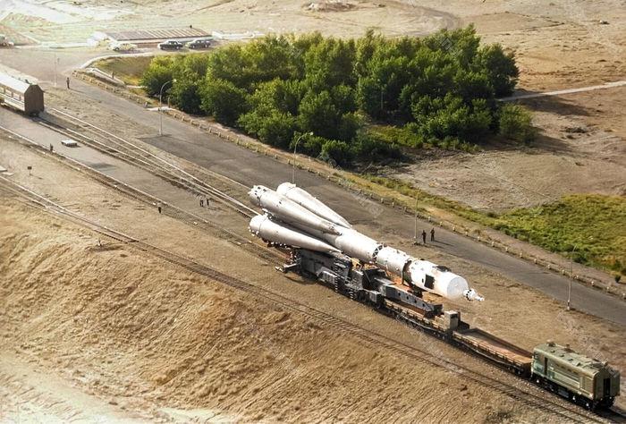 Транспортировка ракеты-носителя с космическим кораблем "Союз-21"на стартовую площадку. Космодром Байконур. Казахская ССР, 1976 год.