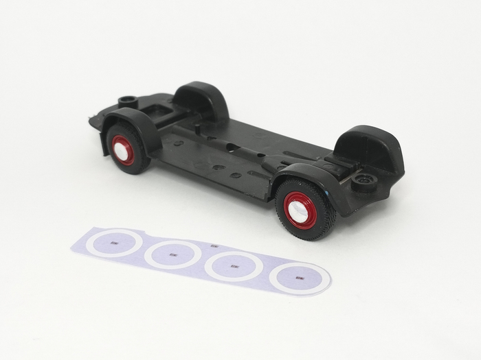 Чтобы модель смотрелась более стильно, было принято решение наклеить на покрышки декали, имитирующие вайтволлы. Уверен, что такой ход мыслей заказчика только порадует. А для защиты декалей, я нанёс лак на основе эмали X-22 от TAMIYA.