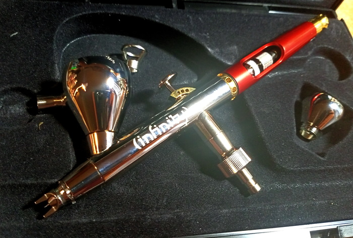 Далее я обратился уже к проверенным специалистам. Ещё свой первый, бюджетный набор для аэрографии я покупал в интернет-магазине UAirbrush - харьковском центре аэрографии. Как легко догадаться, я тогда в аэрографах и компрессорах не понимал вообще ничего, и одна терпеливая и весьма компетентная девушка (не помню имени, к сожалению) очень помогла мне с подбором того, что мне понадобится, попутно объяснив многие нюансы и тонкости. В этот раз я попал на консультанта Станиславу, и она оказалась не менее компетентной и терпеливой. В итоге мой выбор остановился на аэрографе линейки Infinity с комплектом сопло+игла 0.15 и 0.4 мм, а также со сменными бачками для краски на 2 и 5 мл.