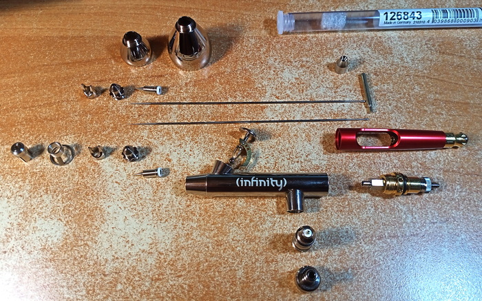 В самом кейсе - собственно аэрограф с комплектом 0.15 мм (иглу защищает транспортировочная насадка, через которую нельзя красить) и бачком на 2 мл, сменный бачок на 5 мл, в пластиковом тубусе сменные игла, форсунка, сопло и насадка диаметром 0.4 мм, и в ZIP-пакете ключик для регулировки/разборки аэрографа и насадки для сопла 0.2 мм.