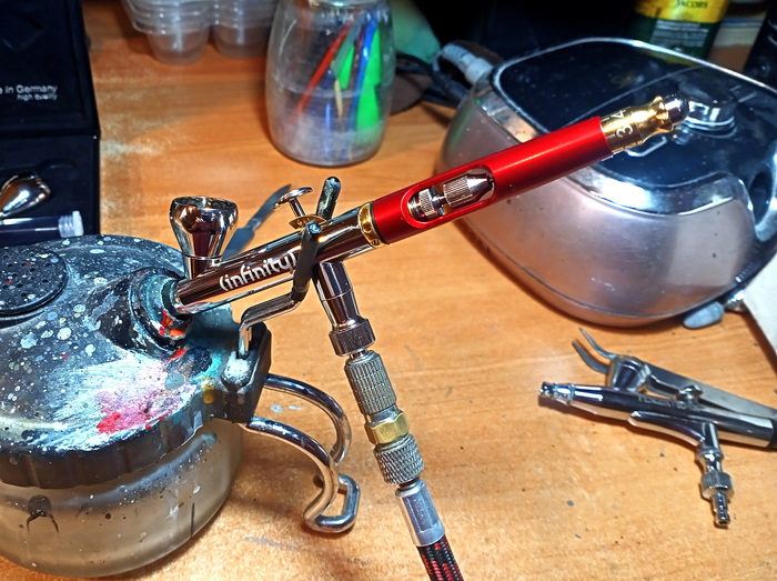 Infinity собран и подключён к моей системе. Пришло время тестов! Для начала я погонял аэрограф чистым воздухом, а затем с обычной водой - так рекомендовала Станислава.