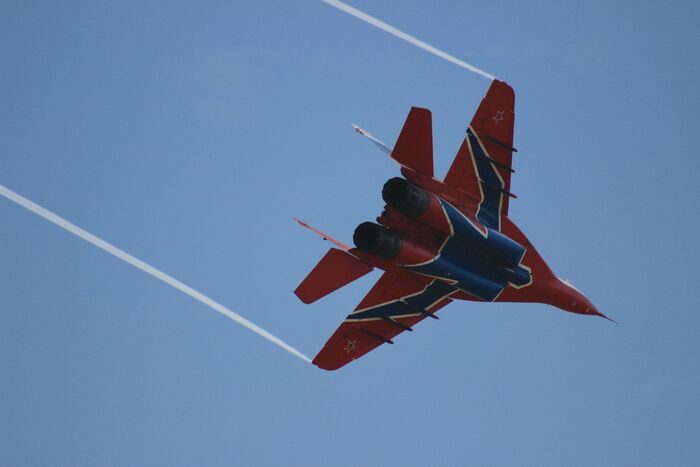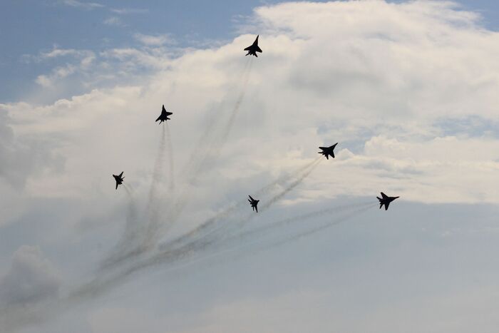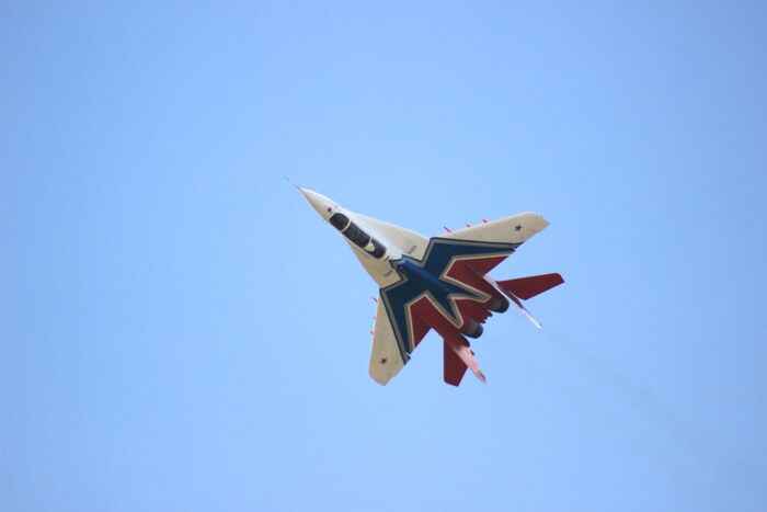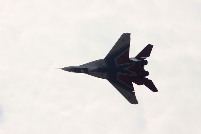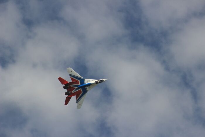 Разведчик пилотажной группы "Стрижи" прилетел оценить погоду над аэродромом. "Стрижи" летают на МиГ-29, базируются в Кубинке, под Москвой